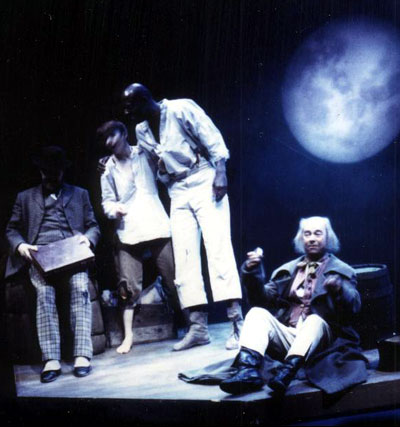 The Duke (Ian Gelder), Huck, Jim, The King (David Killick)